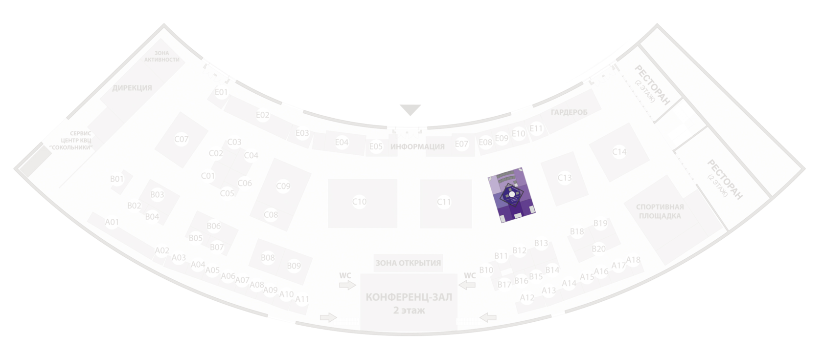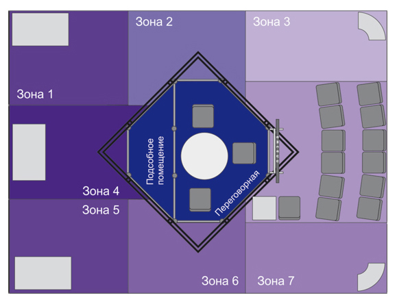 Принцип построения - площадь свободного конфигурирования, на ней - функциональный "донжон", в котором спрятаны подсобка и переговорная, на стенах во все стороны мониторы, а наверху - рекламно-информационный куб.