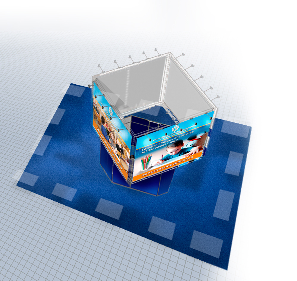 "Фишка" в том, что соразмерно масштабу стенда рекламный куб - заметно крупный, неожиданно повернут от оси стенда, как бы парит самостоятельно.